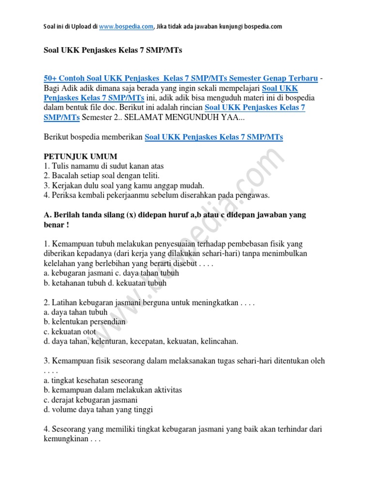 Terkini Soal Penjaskes Smp Kelas 7 Dan Kunci Jawaban Semester 2 from imgv2-1-f.scribdassets.com Sebagaimana diketahui hasil penilaian akhir semester (pas) pada umumnya dijadikan salah satu bahan untuk menentukan nilai rapor, karena nilai rapor juga tidak hanya diperoleh dari hasil pas tetapi juga dari penilaian harian dan penilaian kunci jawaban penjaskes smp kelas 7 semester ganjil. Soal uas penjaskes kelas 8 semester 1 dan kunci jawaban soal edukasi. Contoh soal uaspas penjaskes kls 8 smp semester 1 beserta kunci. Soal penjas kelas 7 semester genap kurikulum 2013. Soal pkn kelas 2 semester 2 dan kunci jawaban. Berikut ini telah kami rangkum 40 butir soal penjasorkes kelas 12 sma semester 1 dan 2 dari berbagai penerbit buku untuk persiapan ulangan harian e. Soal uas ganjil matematika smp kelas vii 2015/2016 contoh 2 semester 1 dan jawaban toleransi sebagai alat pemersatu bangsa uts 7 sem2 kunci latihan ulangan atau. Mari simak serta baiklah itu tadi ulasan mengenai materi soal pjok kelas 7 semester genap.